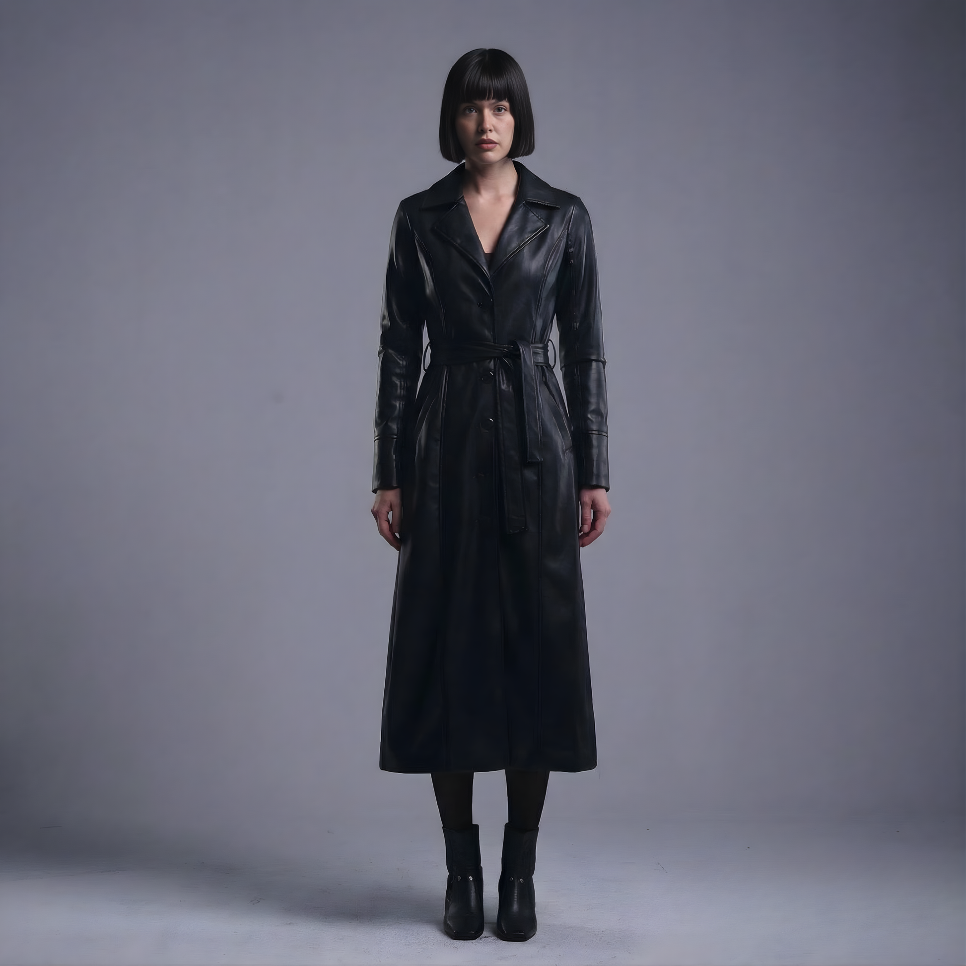 Designer leather coat for women that gives your winter wardrobe a powerful, elevated edge. This long black Lazar Coat is crafted from premium faux leather with a sleek trench silhouette, structured shoulders, and a waist-defining belt that flatters every size