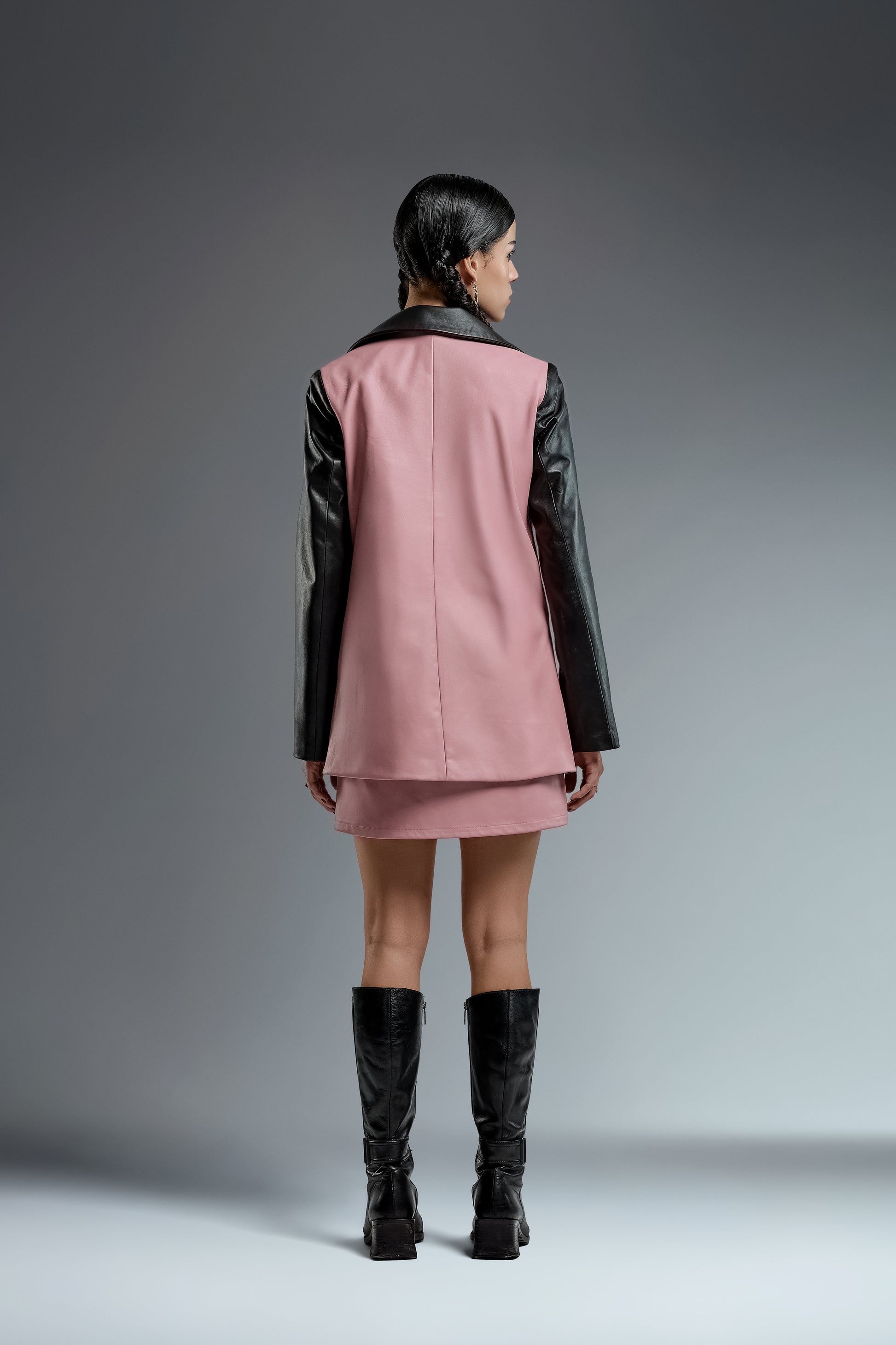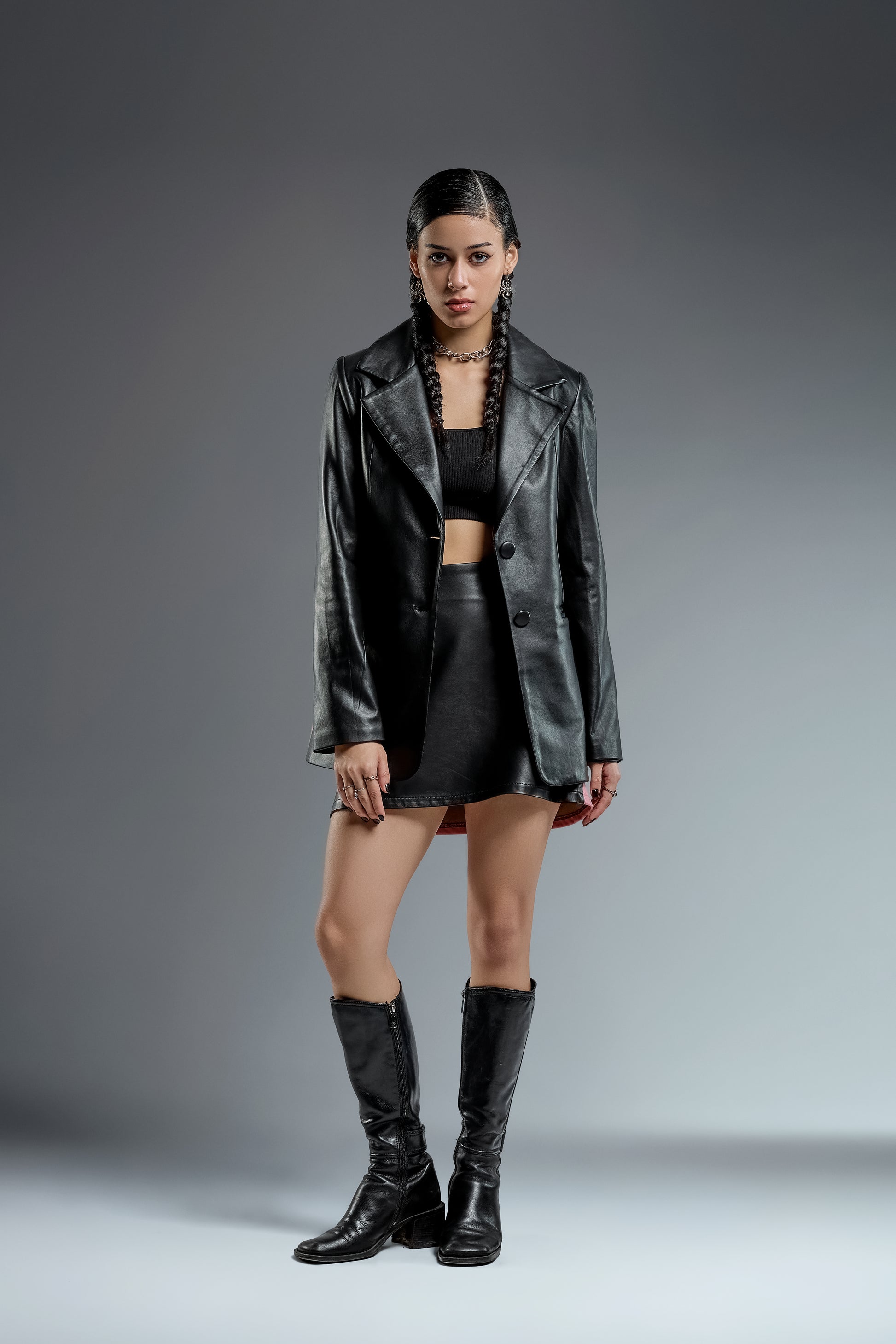 A stylish blend of faux leather and lace for timeless evening wear